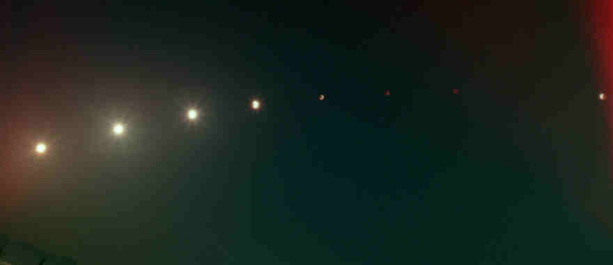 22:00, 22:30, 23:00, 00:00 各5秒 石川県七尾市江泊 月食の進み具合を、フィルム1コマに撮ってみました。望遠レンズのフードを利用して遮光キャップを作り、だいたい30分ごとにキャップを外して露光したものです。 気を付けてはいたんですが、左側と右端が赤色ライトの光でカブってしまいました。雲がかかっていたため、23:30ごろの露光ができませんでした。00:00の露光を最後に、それ以降が撮影の範囲を超えて写っていませんでした。月の軌道を意識しすぎてカメラを傾けたのも、不自然なアングルになりまずかったです。対角で撮れば00:30の月も撮れたかもしれません。それと、20:01、20:32の撮影は捨てて、20:45から30分(あるいは20分)ごとに撮るスケジュールでも良かったかと、いろいろ反省(悔やみ)がありました。 なかなか期待通りにはいかないものですね。 |