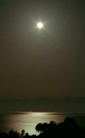 フジスーパーGエース800 露出(70mmF8)10秒 石川県七尾市江泊 こちらからは富山湾の対岸にある、北アルプスから上ってきた月。露出を長めにして、海の照り返しをねらってみました。 |