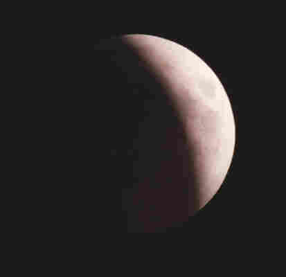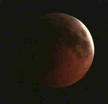 石川県七尾市江泊 これは天体望遠鏡での撮影です。 月食が始まってから4分の3ほど進んだ月。ふだん見る欠けた月とは違い、影の部分が赤みを帯びています。 |