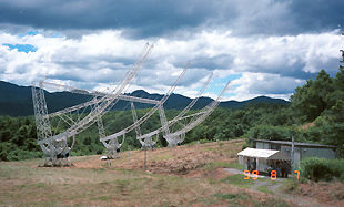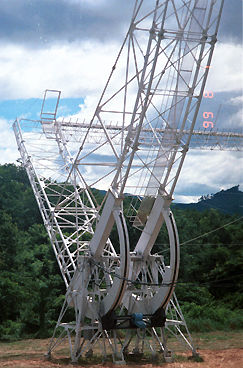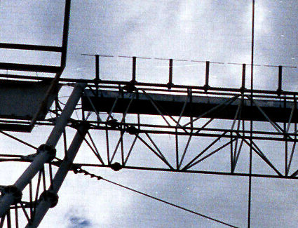 ![]() ダイポールで構成されたアレイアンテナ(T字型で多数並んでいる) 横方向に一面に張られたピアノ線もかすかに見える |