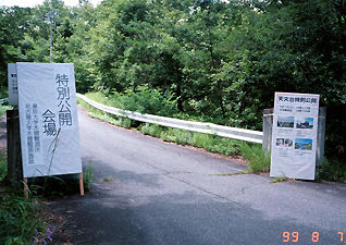 案内板の通りに林道を車で登って行くとありました。ゲートの設置された脇道に「特別公開」の看板が立てられていて、そこから先は大学の敷地内になります。2時過ぎ着、家からここまで、だいたい220kmの距離でした。