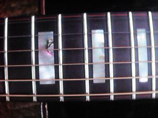 とても綺麗な仕上げの指板。オリジナルのインレイを取り外して、そっくりに作って頂きました。バインディングの内側の赤のラインも入れて頂きました。