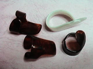 aya−yuはフィンガーピックで弾くのが気に入っています。高校のころは金属を使っていましたが、今は全てプラスティック製です。やすりで先を削って、火にあぶって形を変えてあります。初めて火であぶった時はプラスティックなので燃えてしまったり、とけて捻じ曲がったりしないか心配でしたが、うまくいきました。指で弾くととても暖かい音が出るし、微妙な音色の変化がつけられますが、フィンガーピックのパリーンといった感じの澄んだ音もいいものです。始めは音そのものが出なかったのですが、石の上にも三年。今はフィンガーピックなしのアコースティック生活は考えられません。