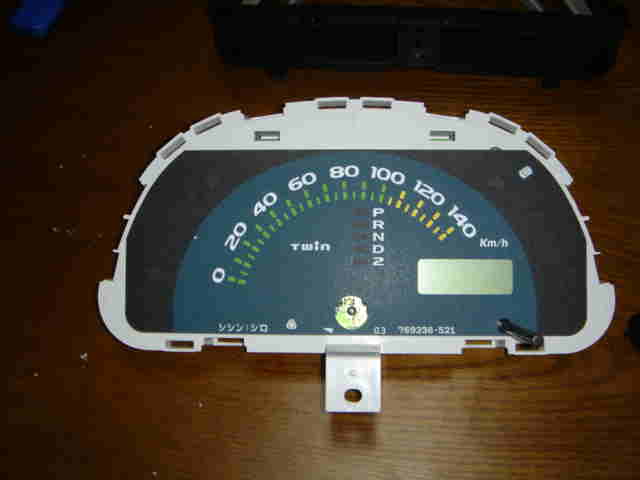 | メーター改造でネックになるのが、針の取り外しです。無理に力を入れると壊れてしまうことが多いようです。ところが、ここでもツインは比較的楽に針が取れます。私は、フォークを差し込んで、てこのようにしてなるべくまっすぐ針をシャフトから抜きました。 GT−Rのメーターの針を外そうと、無理矢理引っ張ったら、シャフトごと抜けてしまった事があります。無理をしない方がいいですね。 文字盤のパネル板もはまっているだけなので、簡単に外せます。 |