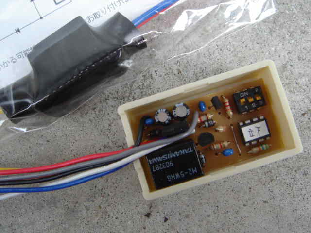 | この小さな箱(幅5cmくらい?)にIC、時間調整用DIPスイッチ 小型リレーなどが組まれています。ただし、内部のリレーは定格が1Aなので、モーターに使うのは無理。で、10Aのリレーを別に組み合わせることにします。(上にある黒いパッケージが10Aリレー)こんだけあれば、助手席側と同時に使っても良さそうだと、購入先のFijiさんが親切にもメールで教えてくれました。 製品はメールで確認した後、着払いの郵便で送られてきます。 |