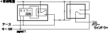 こんな感じでつないでみました。キーがオフの場合は、パワーウィンドウへは、キーonのラインに繋がっています。 ところが、キーをonにして、リレーユニットのinput1に信号が入ると、タイマーユニット内のリレーが繋がります。 すると、10Aのリレーがonになり、パワーウィンドウのラインが常時電源に切り替わります。 キーをオフにすると、input1への信号が切れますが、設定した時間だけ遅れて、ユニット内のリレーが切れ、これによって10Aのリレーもオフになります。 |