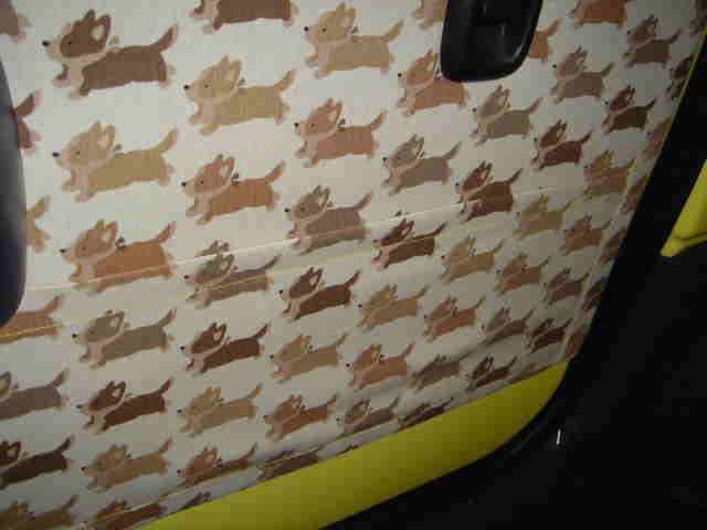 | で、完成(速)作業は簡単なので書くほどのことの無いでしょう。ドアパネル外す、布おく、裏からガムテープとホチキス(タッカー)で留める、おしまい。ただ、ドアのアームレストの取り外しや取り付けについては、ツイン関連の掲示板でOYAJI40さんが、親切に教えてくれました。感謝です。ま、しかしこの柄で良かったかどうかは。。。。カワイイから良しとする。 | |