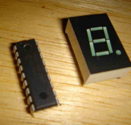 使用した緑色7セグメントLEDと、ワンチップマイコンのPIC16F84。小さい小さい!電子パーツなんて単価は安いんです。LEDも百数十円だし、マイコンチップなんか380円でした。フォトカプラなんか1個50円。でも、安くはあがりませんねぇ。。。。。これが。 |