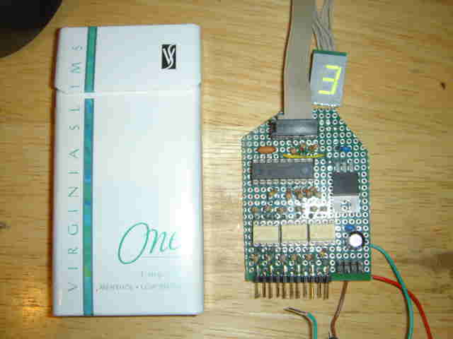 四苦八苦しながらも、なんとか試験ボードでの動作が出来るようになったので、いよいよ取り付けです。パーツを穴あき基板に並べてハンダ付け。ま、実際は、これもやってみたら動かずに、部品を外して付けなおしたりプログラムの手直しとか大変でした。