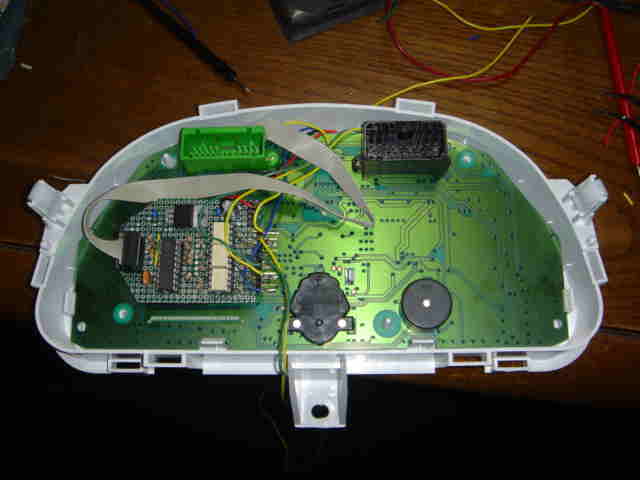 | 基盤は、メーターハウジングの中に組み込むことにします。電源、シフトインジケーターの信号(P,N,Rの3本)、ディマー信号とすべて、メーターに来てますので、この中で直接配線できてしまいます。外に出すのは、ソノレイド信号用の2本だけで済みます。 | |