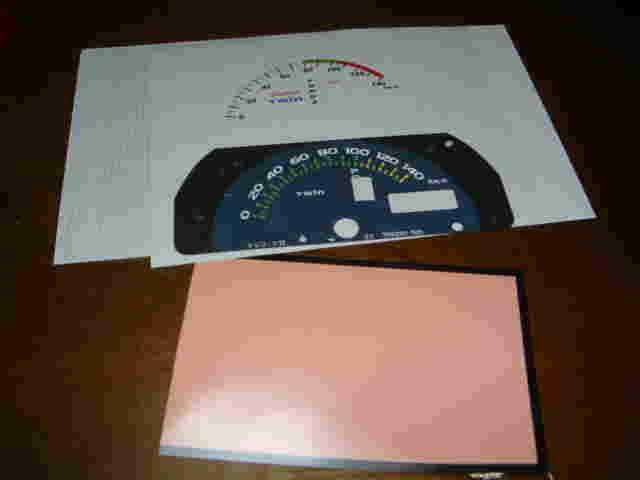 | ふたたび、メーターパネルを作製します。今度は、表示用に四角い穴を開けねばなりません。デザインも変更したいけど、もはや疲れてしまいアイディアが浮かばないので小変更にとどめます。ELパネルは、大きなサイズをネットで見つけました。(共立エレショップ)これなら、ツインのパネルを1枚でまかなえます。インバーターは別売りになります。EL発光用の回路は、前回のものがそのまま使えました。また、以前の物よりも少し薄いのでカットするのが楽でした。 | |