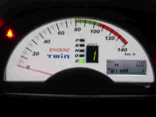 | ギヤを走行可に入れて、停止してると1速を表示しています。夜なので少し減光しています。キーをひねってOnにしたとき、オープニングとして0をくるくる回すような動作を入れました。バックギア(リバース)の「R」は表示できないので、「A」になっちゃいます。そこで、バックギアの時には点滅動作を入れています。 |