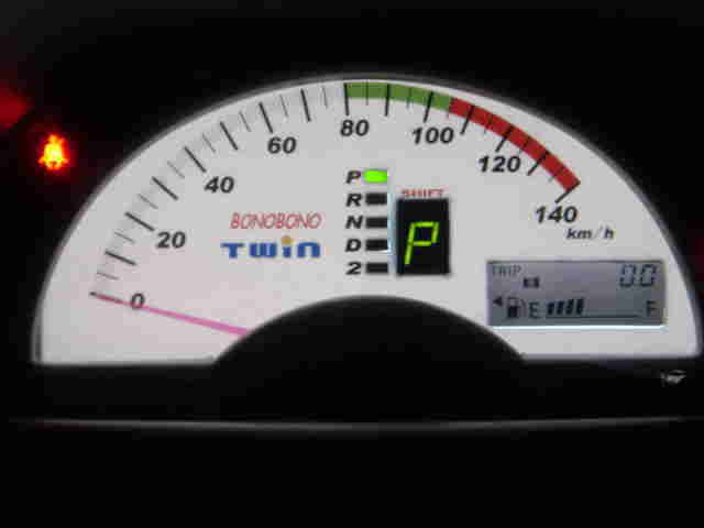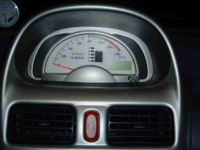 | ついに組み込んで完成です。シフトインジケーター部には、ブラウンスモークのアクリル板をかぶせてあります(フロッピーディスクケースのふたを削って製作しました)。メータ指針も実は新作で、蛍光の赤。照明を付けると結構目だちます。 | |
