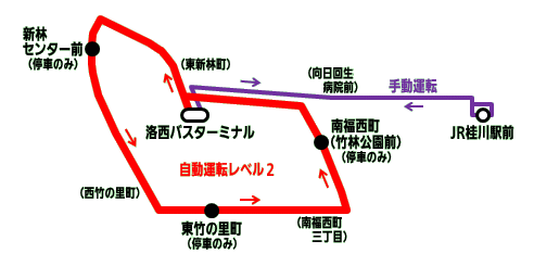 2026年3月24日 (停車全停留所を表示、( )内は通過停留所) [手動運転]JR桂川駅前→(物集女)→(境谷大橋)→洛西バスターミナル [自動運転]洛西バスターミナル→(東新林町)→新林センター前(停車のみ) →(西竹の里町)→東竹の里町(停車のみ)→(南福西町三丁目)→南福西町 (竹林公園前)(停車のみ)→(境谷大橋)→洛西バスターミナル [手動運転]洛西バスターミナル→(境谷大橋)→(物集女)→JR桂川駅前 2026年3月29日 運行終了 路線図 ![]() 運行ダイヤ