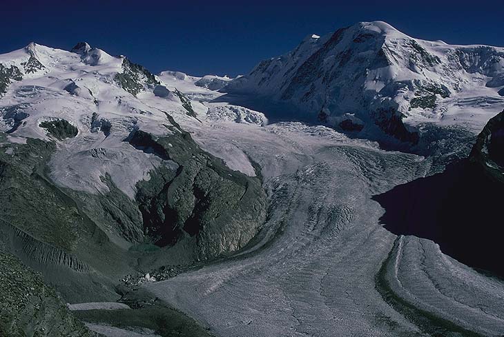 ホテルから見るGrenz氷河。右はリスカム(4527m),左はモンテ・ローザ(4634m)