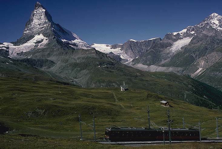 ゴルナグラート登山鉄道の乗り場は氷河急行のZermatt駅に隣接している。Zermatt(標高1616m)からゴルナグラート(3089m)までを,アプト式で200パーミルの急勾配を登る。リッフルベルグから見る電車とマッターホルン