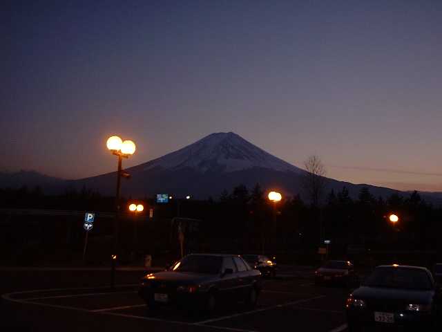 今年(平成12年)の1月の上旬に富士急ハイランドへ行ったときに撮った富士山の写真です。もう日もとっぷり暮れてなかなかいい光景を撮れて本人はえらくご満悦な気分でした。この辺は山間という事で結構雪が降るらしく、ホテルの方に聞いたところた数日前も沢山雪が降ったとかで、私達は本当に運がよかった???