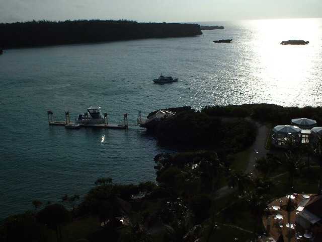 これは確か3時ごろの万座ビーチの入り江で、太陽が水面にあたってきらきらしていました。この写真じゃ海の蒼さがよくわからないのがちょっと残念……。中央の建物はサミットで使用する施設を建設するためのものだそうです。沖縄はサミットを控え活気がみなぎっていました。