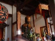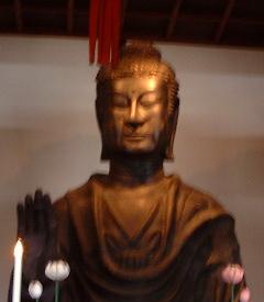 飛鳥大仏の正面ですが、この仏像の表情ってちょっと面白くなっているんです。向かって右から見ると怖い顔で、左から見ると優しい顔なんです。これは本当ですよ。実際にお寺の方の説明受けてから両方の側で見てみましたから。