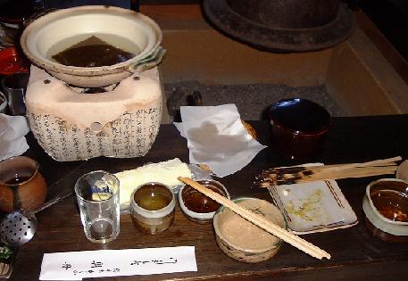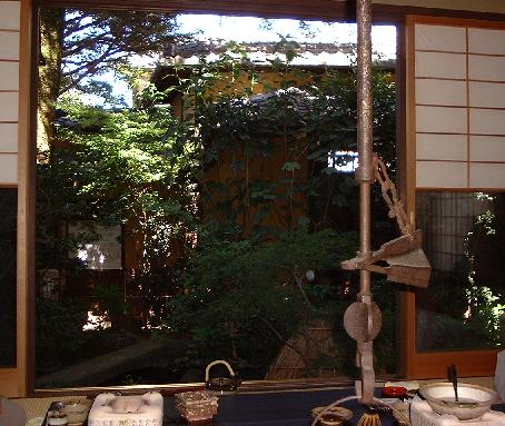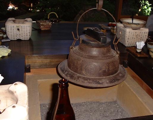 これが「奥丹清水店」の入り口。 通された部屋の窓の外です。 テーブルの真中にある囲炉裏です