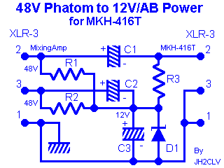 ミキサーが供給するファンタム電源のパワーは、メーカーによって異なるので、ここでは一例として記している。また48Vファンタム電源は、チャンネル毎、複数チャンネルのグループ、全チャンネルなど、供給方法もミキサーやメーカーよって様々だ。 今回はやや急場しのぎ的な感が強いので、極力簡単で手持ち部品で対応できる回路とした。左図がそれで、入出力にXLR3タイプのコネクタをオスメスで配し、間に1:1のマイクトランスを挿入。ミキサー側のトランス1次側CT(センタータップ)よりR1を経由し、C1(ケミコン)とD1(12Vツェナーダイオード)で12Vを生成する。この1Vをトランス2次側のコールド側に供給し、ホット側を出力させる。 AB方式のファンタムは、マイク電源と音声が重畳され、かつコールド側は接地される不平衡回路である。したがってこの装置の挿入場所は、なるべくMKH-416Tの近くが好ましく、ミキサ側の近くへの挿入はノイズを拾い易い。 |