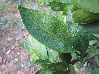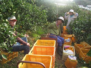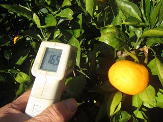 早生ミカンの収穫が終盤になった。舞台の生りがやたらと多く、一度田んぼの早生を切っていたが、再び舞台に戻った。ところが、このところの朝冷えで写真の様に露が多い。冷え込んだミカンや大地と空気間の温度差が原因だと思うが、当地の日の出時間である9時頃になるとそれが更に酷くなる。舞台の園地は密集しているので、木間を歩いただけで上着がびしょ濡れになる程だ。それで、一体どの程度の温度差があるのかを測ってみた。オンマウスは日の出で気温が上がり出す9時頃に撮影したもの。この日、日陰にある果や地面はだいたい5〜6.5℃程度を示していた。それが陽が当たり出すと、果も葉も16℃程度へ上昇する…しかも短時間で。風が吹いて空気が流れていれば露はつかないので、大型扇風機などで空気を流す措置をすれば対策が出来ると思われるが、そこまではやってられない。もっと冷えが強ければ表面が凍ってしまうだろう。それで、太陽の熱で露が乾いた場所から収穫が始まり、完全に露を気にしなくて良い時間は11時頃になる。このため複数人が園地に入って、一斉に収穫する体制を取っても暫くはノロノロ収穫となり、効率が悪くて悩ましい。午前中2時間ちょっとしか作業できないし、午後は15時半には陽が陰ってしまうから…。 |