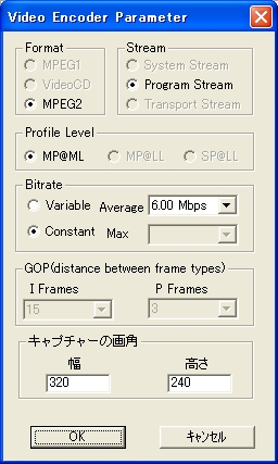 ビットレートはMpeg:1Mbps Mpeg2:6Mpps が標準です。