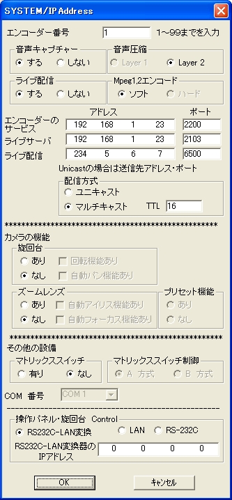 ライブ配信・・・・・ライブ配信のマルチキャスト、ユニキャストアドレス、ポート番号。