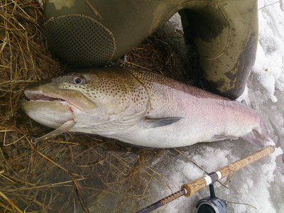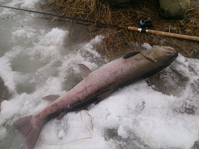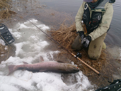3月22日(日) 北の湿原に幻を追うシリーズ 完結(か!?)衝撃の1日だった。9日、まつさんとドライブをしつつ、「イトウ釣りに行きたいんだよねえ。でも、今年は雪が深くてどうもならないよねー」などと話していたのだが、その日帰ると、キンゾーさんが日曜日に94cmと95cmを釣ったという情報が入った。 「おめでとう」とは素直に言えない。と、伝えると、優しい彼が、「じゃあ15日いく?」と誘ってくれた。 しかし、この日はスキーの先約があってだめだった。そして翌週22日。前夜のメール。 「明日、●時にはウチを出るから、それまでにおいで!」 私はすかさず 「わん。」 とだけ、返信を打った。 実は、水曜日の夜から体調が悪かった。仕事から帰ってから、ずっと寝、次の日も午前中で仕事から帰ってまたずっと寝、金曜日にやっとほぼ復調という感じであった。 釣り場までのアプローチは簡単ではないので、体がもつかなと正直少し心配であった。次の日は上の娘の卒業式も控えていて、川で病気をこじらせて卒業式に出られなかったらどうしようなどということも少しは頭をよぎった。娘が「卒業式とイトウ釣りとどっちが大切なの?」と聞いたような気がするが、私は当然「卒業式に決まっているじゃないか」と答えた気がする。まあ、私の本心は娘をはじめ誰もが知っているが、、それを音声化しないことは、とても大切なことなのである。 長いアプローチを終え、キンゾーさんが、同じことを2度言った。 「今日は、まあきちさんに釣らしてやる。」 私は、心の中で、2度、 「わん。」 と答えた。 キンゾーさんは、あそこに打ちこめ。あそこはこういう流れで、こう深くなっていて、魚はこうついている。きっといるはずだ。などとポイントポイントでアドバイスをくれ、ほとんど私を先行させ、自分では竿を振らなかった。 釣り始めてほんのしばらく後に、とてつもない魚が掛った。 ↓ ↓ ↓ ↓ ↓ ↓ 10数分のファイトの後、彼は観念して寄って来た。 ↓ ↓ ↓ ↓ ↓ ↓ そして、無事取りこんで計測すると、 ↓ ↓ ↓ ↓ ↓ ↓ ![]() なんと、102cmあった!!!! ![]() ↓ ↓ ↓ ↓ ↓ ↓ とうとう、念願のメーターオーバーを釣りあげた! ↓ ↓ ↓ ↓ ↓ ↓ ↓ ↓ ↓ ↓ ↓ ↓ ↓ ↓ ↓ ↓ ↓ ↓ ![]() キンゾーさんがね! いやあ、すごいものをみましたよ。ヒットの瞬間こそ見逃しましたが、ファイトシーンもランディングも一部始終を脳裏に焼きつけました。いやあ、がんばって行って良かった。 え?私? 私は、アタリすらありませんでした。ウグイだって、アメマスだって釣れませんでした・・・。 でもねえ、これが私に掛った可能性も結構高くあったんですよ。一度だけキンゾーさんと私が前後入れ替わった直後に、キンゾーさんにこの魚が掛ったんです。だから、もし私にこの魚が掛ったらって妄想を、この24時間で24回はしました。はい。 じゃあ、この魚を釣りたかったかって言うと、それはちょっと微妙。 もちろん釣りたいですけれど、 ものには、順序ってものがありますから。 この魚は、キンゾーさんが釣るべき魚だと、これはちょっとの嘘偽りなく、そう思います。 そして、ただ一回だけの入れ替わりのタイミングで、彼にこの魚が掛ったのも、きっとそうあるべきだったからだと思います。 さて、 帰り道、体調が完全に回復しているのを感じた。 同じ経験を前にもこの川でしている。 体は疲れているし、靴ずれは痛いが、体の中につまっているストレスやら病原菌やらアルコールやらがみんなどっかに抜けたような感覚があるのだ。 楽しかったなあー。 イトウもすごかったけれど、何十匹もの鹿の群れやタヌキやミンク、ヤマセミにカワセミ。 雁や鴨や白鳥、タンチョウ。アトリ等の冬鳥の群れ。オジロワシ。 面白かったのはコレ。特大の蛙の卵塊。 ![]() ![]() と思ったら、氷の下にある、エゾシカの糞だった。 また行こう。今度こそは、しっかりと自分のロッドにイトウの重さを感じるために。 ![]() 靴下が合わなかったのか。これまで、あまりしなかったのだが。 余談 おかげさまで、超絶好調でいくらでも仕事できるぜぃっ!てな感じで、次の日の卒業式に出席することができた。 しかし、人ゴミと、どーでもいい来賓の挨拶と、心に染みない諸々で、式が終わる頃には、もう川で充電した生気は全て吸い取られていた。 式が終わって、6年生の教室で、卒業生が一人一人親に向かって感謝の言葉を言うという場面があった。 「今まで言えなかったけど、本当はとても感謝しています。」 娘は、我々に向かい、そんなことを言った。抜けた生気がまた充電される。 「ああ、この子も随分と立派になったのだなあ。」 そして、彼女が読み上げたメッセージカードを受け取る。 ![]() ん? 「母さんへ」だぁ〜!? なんじゃわれ〜! おめえの親は、母親だけか?ん? じゃあ、俺はなんだってんだ? カメラマンか?お?カメラマンか? じゃあ、飯も作らんぞ。洗濯もしねーぞ。 なんだって?お手伝いさんだと〜!? よーく言った、お