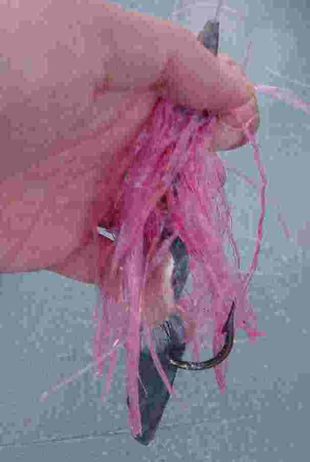 ←これが、今回使った擬似餌である。どこにでもある梱包用ビニールロープに、オモリとフックが付いているだけである。これだけでも釣れるが、今回は針にカツオの切り身をつけた。イカつきタコベイトみたいなものである。
