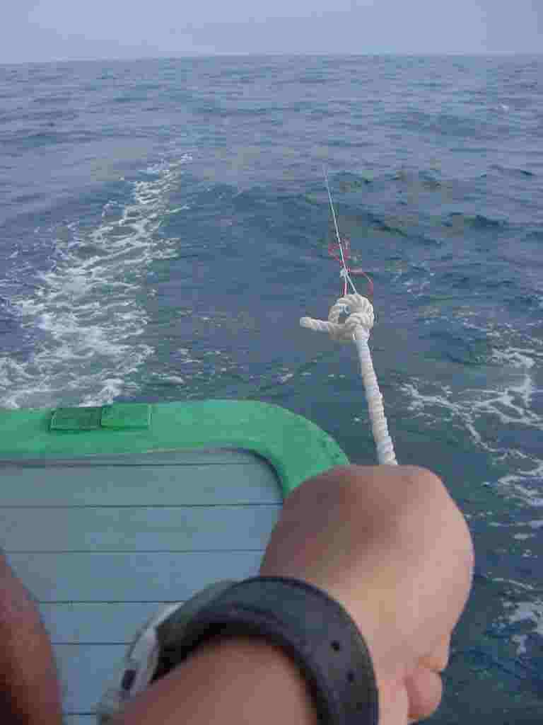 このように、竿を使わず、手でラインをもって流すのだ。釣れる魚の歯が鋭いため、きっちりとリーダーにはワイヤーラインをつかっていた。魚を釣り上げた後。左手の人差し指に軽い焼けどをしてしまった。