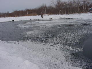 割った氷が、風や流れであっちこっち移動するので、我々は開いている水面を求めてジプシーのように釣り歩いたのだった。