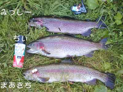 54cm〜58cmの釣堀虹である。 画像は、当日のゲスト、ぢぃさんからいただいたものだ。 みっしーさん、ぢぃさんは持ちかえって食べたらしいが、 もう料サバくのも、魚料理が続くのもウンザリなので、 近くで釣っていた子供にあげてしまった。