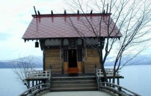 湖岸にはいくつかの観光スポットがあり、駐車場と土産物屋、食堂などがあるが、中心はやはり辰子像になる。昭和43年に船越保武氏によって作られた彫刻である。すぐそばに浮木神社と言うのがあって湖に少しせり出して作られている。社の中には竜の絵が飾ってあるのだが、「浮木神社」と書かれた看板には小畑勇二郎と署名がある。この男は元秋田県知事(故人)であるのだが、実は辰子の亭主の仇敵である。