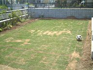 ひたすら芝を張って行くと・・・「あらら?足りない。」計算では足りるハズだったのですが、5束分ぐらい足りません。買い足しに最初とは別のホームセンターに走りました。ホームセンターの芝売り場につくと「最初のとこより一束50円も安い!」しかも青々としていた状態もよさそうです。まぁ最初のホームセンターは積みこみをしてくれたのを考えればトントンですが・・・