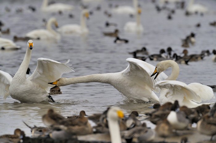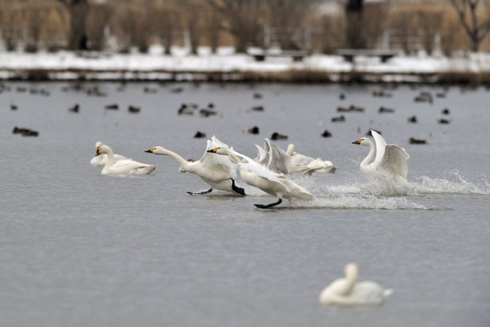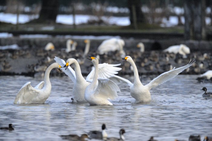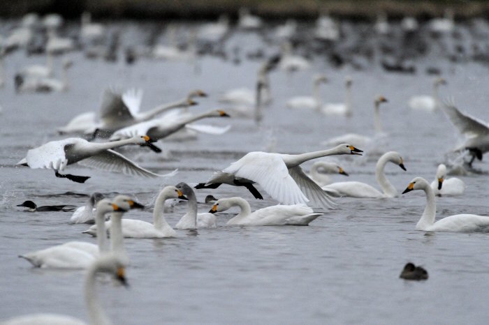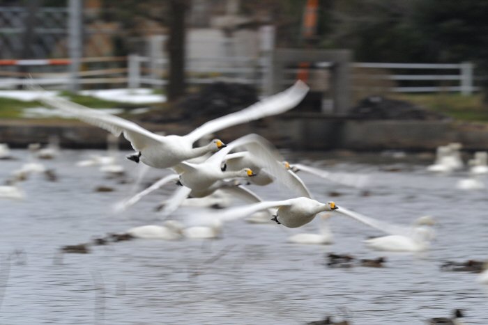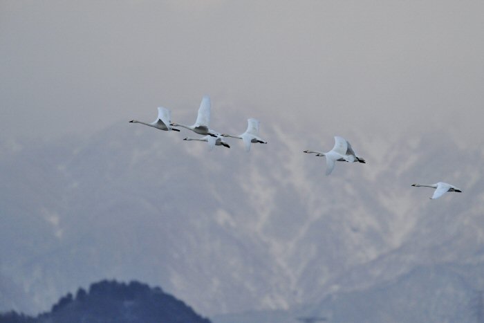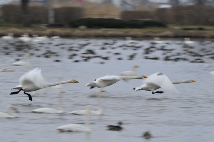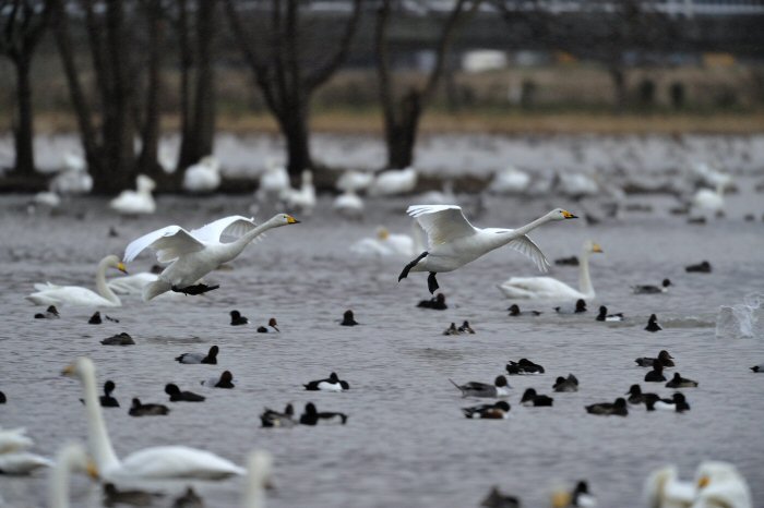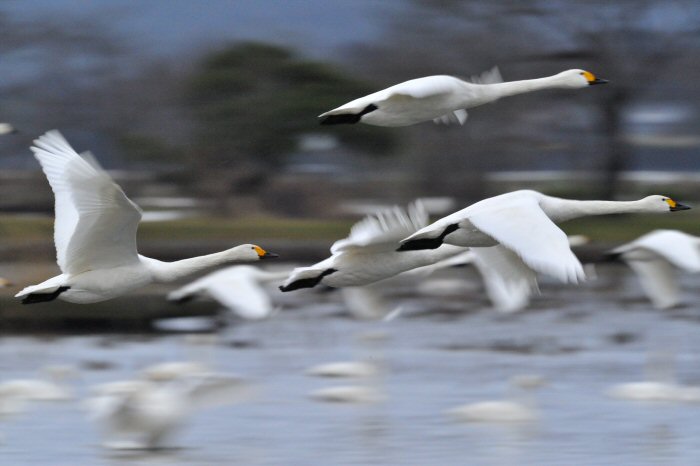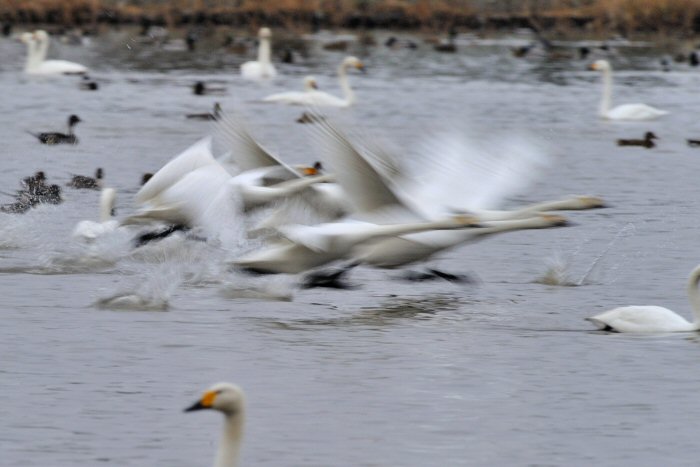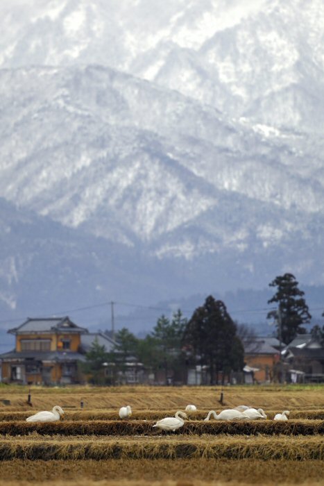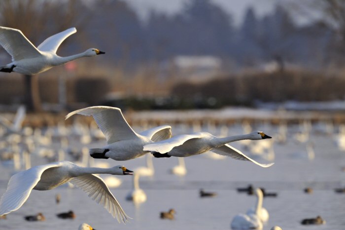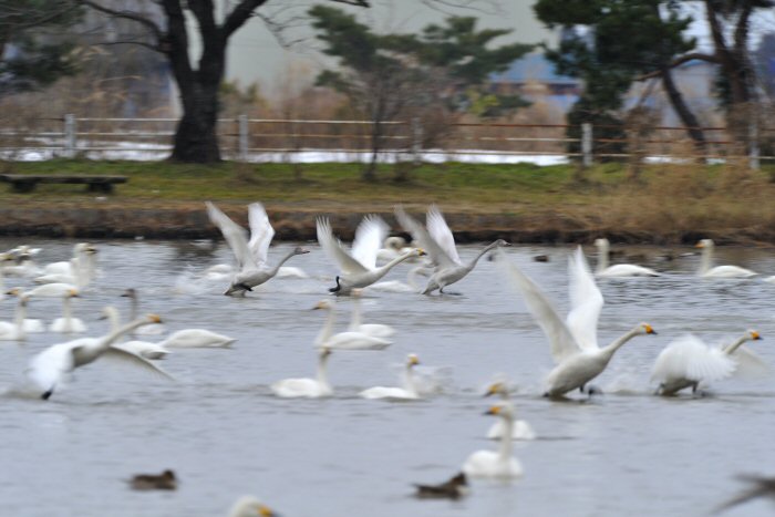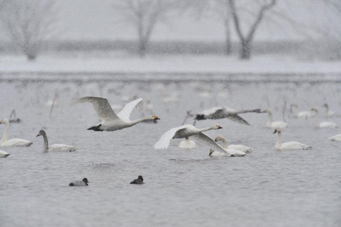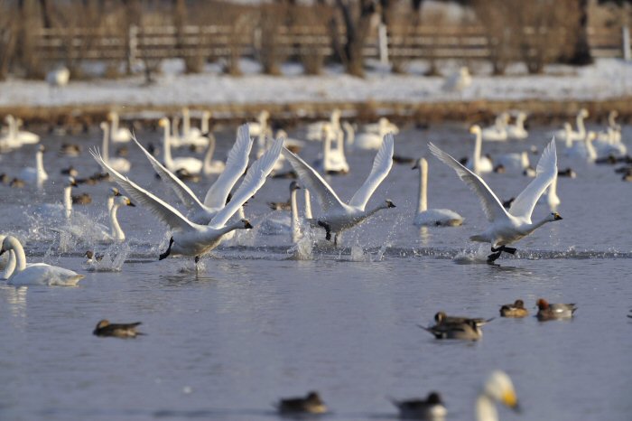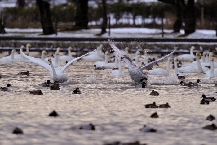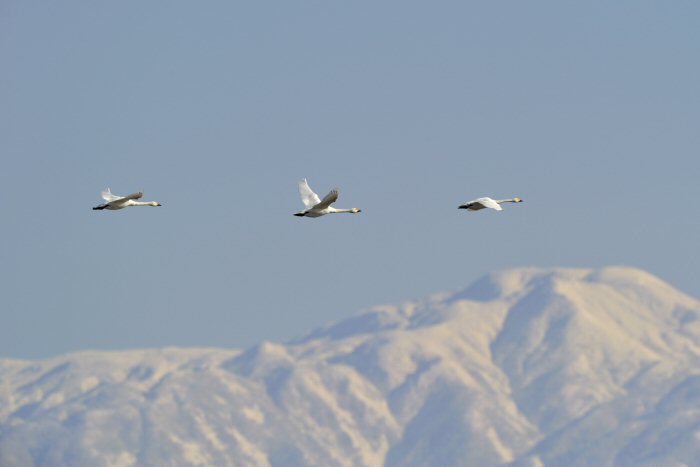 私にとって、瓢湖で2シーズン目の白鳥の撮影です。 この瓢湖は毎年シベリアから6000羽以上の白鳥が飛来する有名な湖です。 今回の白鳥の数は、前年と比べて半分以下の約2300羽です。それは年末の大雪で白鳥が南下した為です。 滞在期間中は、あまり天気には恵まれず(風は強くはなかったです)、晴れたのは1日のみです。 でも雪が降ったので、雪をバックに白鳥の飛び立ちが撮れて良かったかな。 田んぼで餌をあさる白鳥の姿も拝見して来ました。 瓢湖は、雲の無い早朝、日が昇る前(辺りはまだ暗いですが)に、五頭山頂の空がまれに真っ赤に染まる事があります。 滅多にありませんが、そんな真っ赤に染まった空に白鳥が飛ぶ姿は感動ものです。また、五頭山頂から日が昇ると 逆光になり湖面が黄金色に染まります。これは晴れれば良く見かける光景です。こんな場面での白鳥も良いでしょう。 早朝急激に冷え込んで湖面から湯気がわく幻想的な場面にも遭遇して見たいものです。 その他に、オオタカも観察して来ました。次回は、オオタカの狩りの撮影にもトライして見ようと思っています。 今回の撮影では地元の方々には大変お世話になりました。ありがとうございました。 また来シーズンお会いしましょう!!この後は、メインの慶良間諸島でのクジラの撮影です!! |