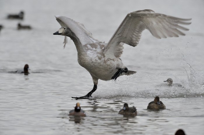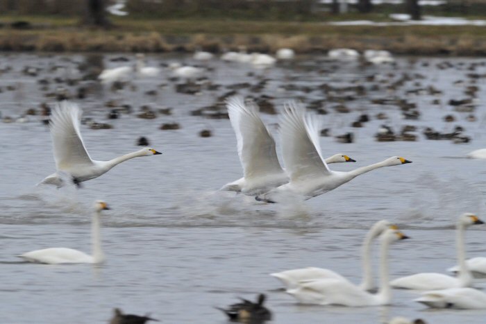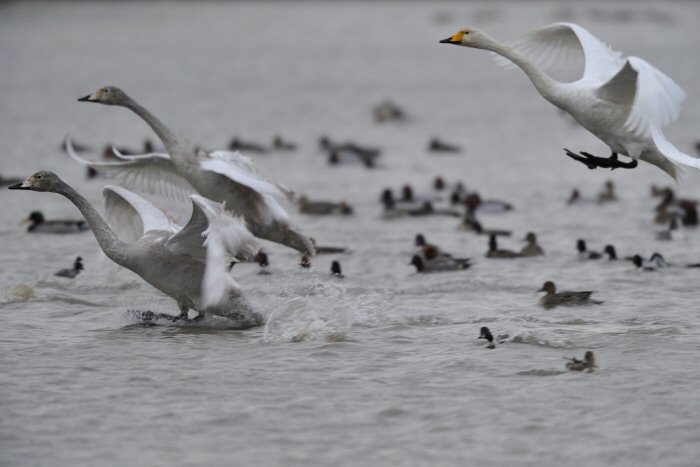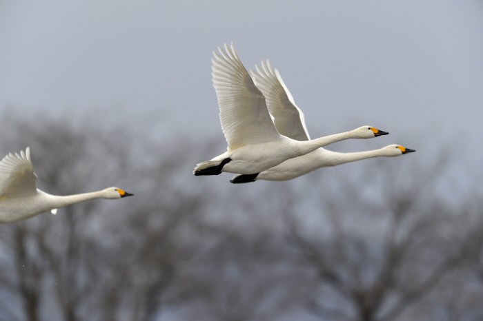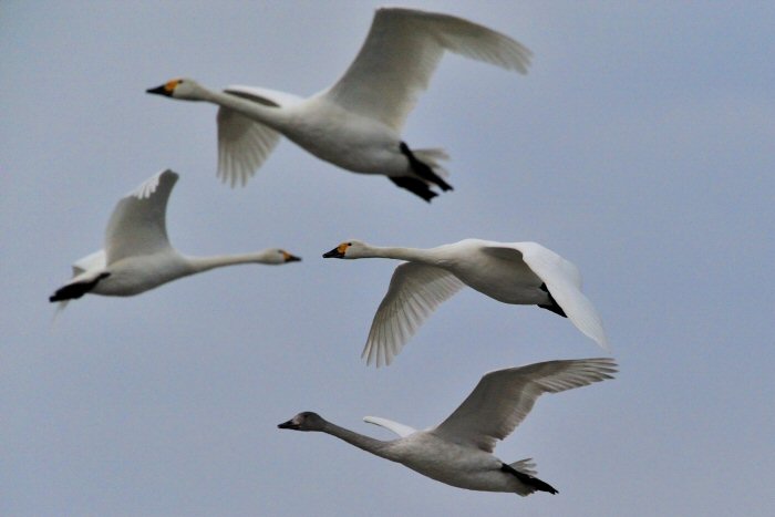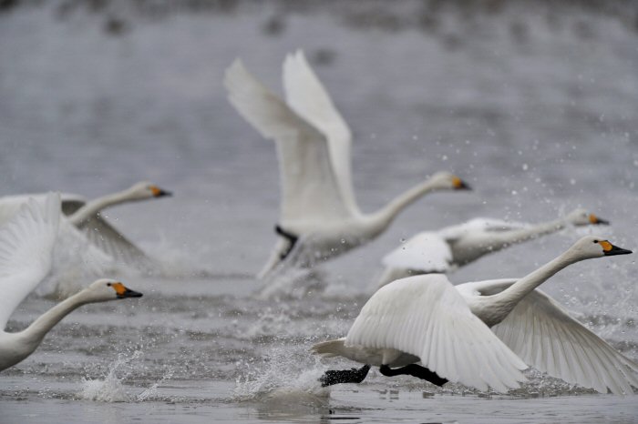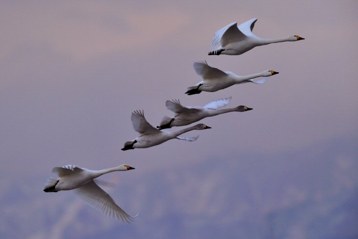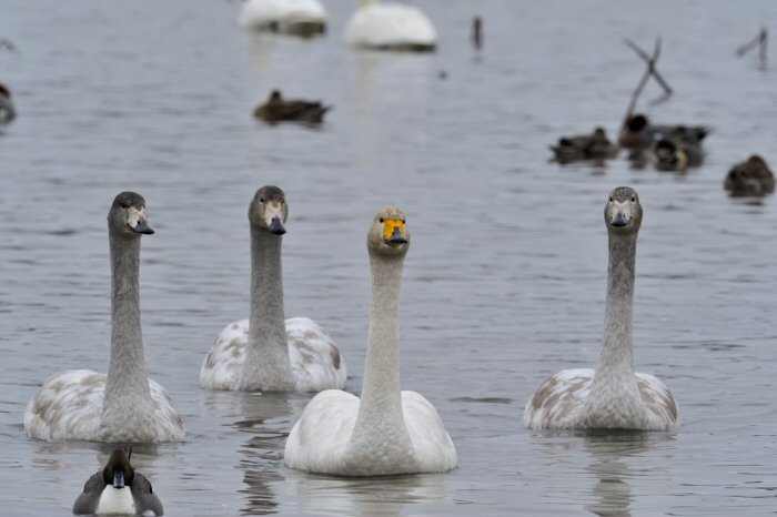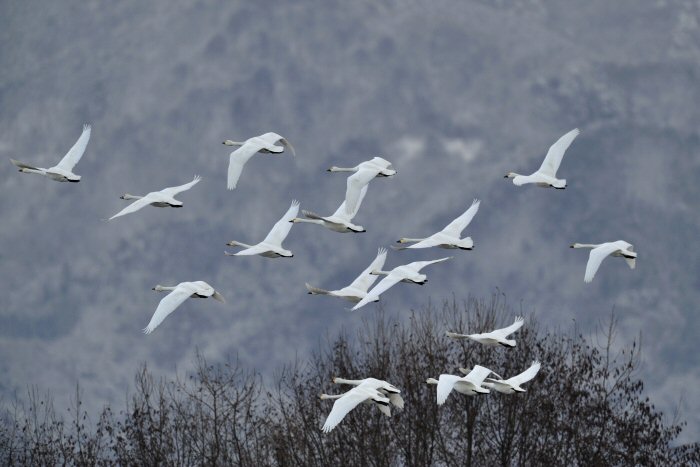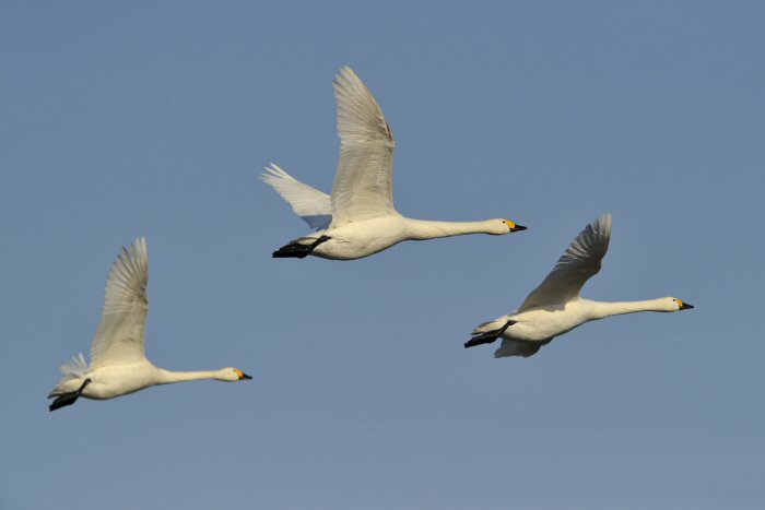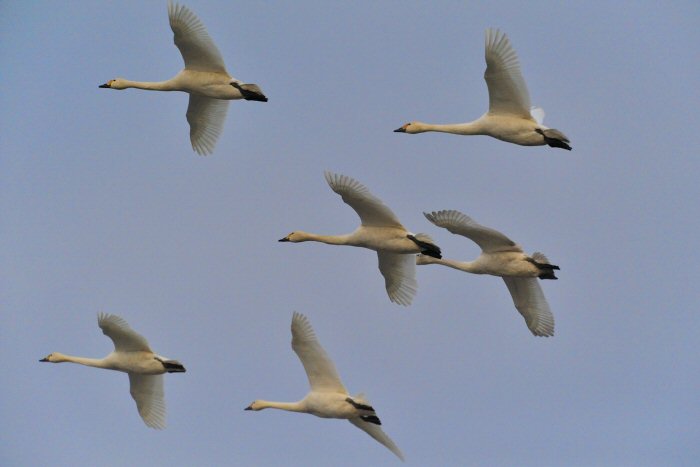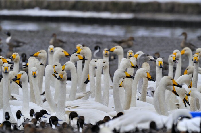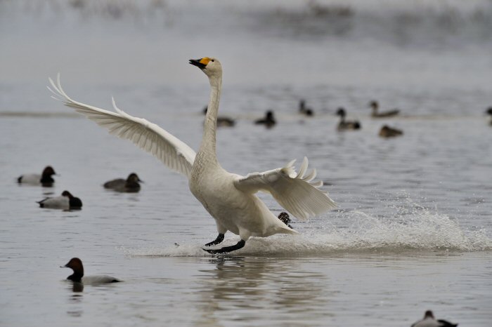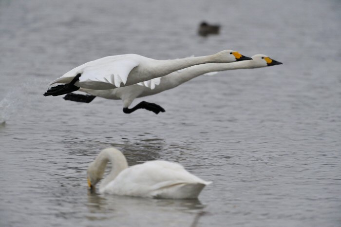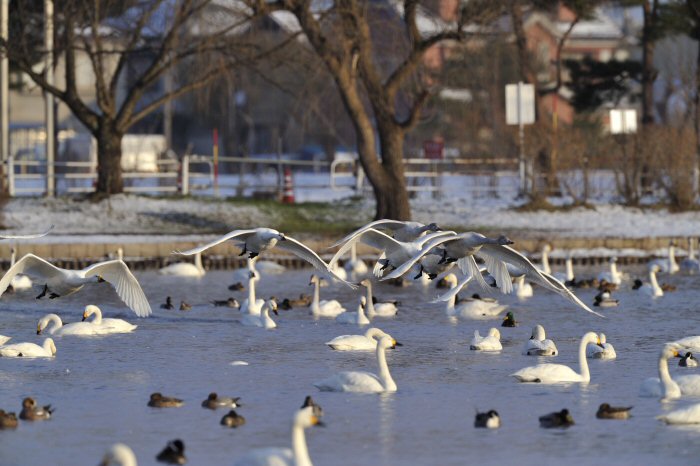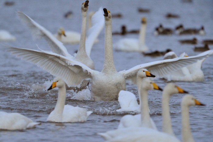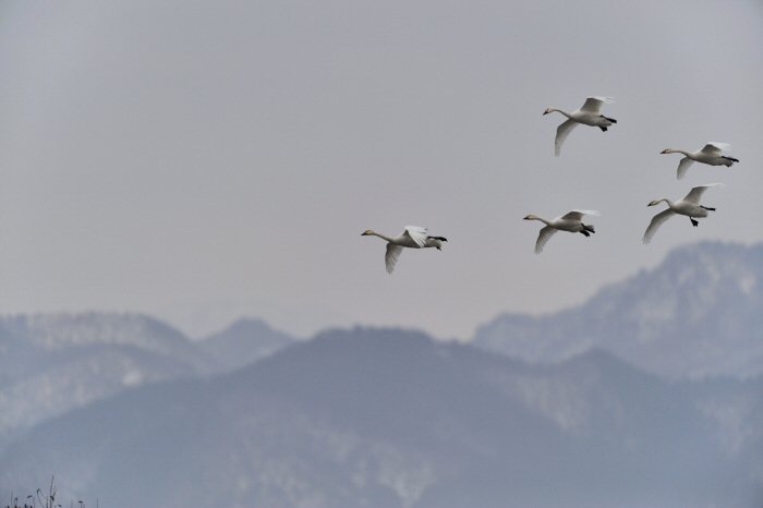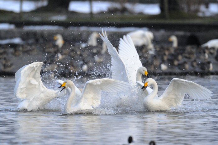 私にとって、瓢湖で2シーズン目の白鳥の撮影です。 この瓢湖は毎年シベリアから6000羽以上の白鳥が飛来する有名な湖です。 今回の白鳥の数は、前年と比べて半分以下の約2300羽です。それは年末の大雪で白鳥が南下した為です。 滞在期間中は、あまり天気には恵まれず(風は強くはなかったです)、晴れたのは1日のみです。 でも雪が降ったので、雪をバックに白鳥の飛び立ちが撮れて良かったかな。 田んぼで餌をあさる白鳥の姿も拝見して来ました。 瓢湖は、雲の無い早朝、日が昇る前(辺りはまだ暗いですが)に、五頭山頂の空がまれに真っ赤に染まる事があります。 滅多にありませんが、そんな真っ赤に染まった空に白鳥が飛ぶ姿は感動ものです。また、五頭山頂から日が昇ると 逆光になり湖面が黄金色に染まります。これは晴れれば良く見かける光景です。こんな場面での白鳥も良いでしょう。 早朝急激に冷え込んで湖面から湯気がわく幻想的な場面にも遭遇して見たいものです。 その他に、オオタカも観察して来ました。次回は、オオタカの狩りの撮影にもトライして見ようと思っています。 今回の撮影では地元の方々には大変お世話になりました。ありがとうございました。 また来シーズンお会いしましょう!!この後は、メインの慶良間諸島でのクジラの撮影です!! |