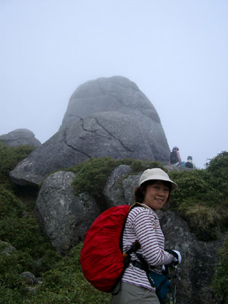天気は霧雨のため、レインウェアーの上着を着て出発。途中下山してくる人に聞くと上に行くと晴れているとのこと。昨日もそんな天気だったらしい。