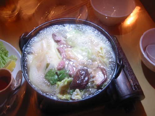 KaKe・Ta鍋(ダチョウの肉、山菜のオオタニワタリの新芽などが入っている。最後は、ベトナムの麺フォーを入れる
