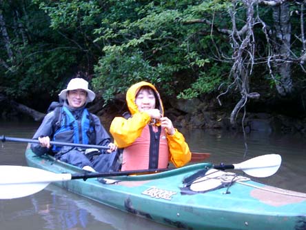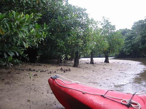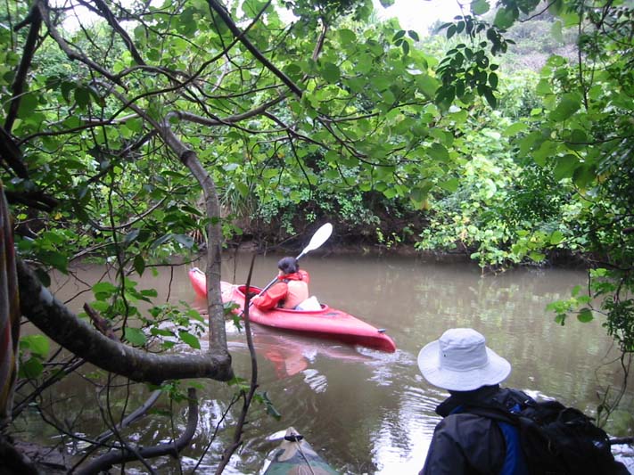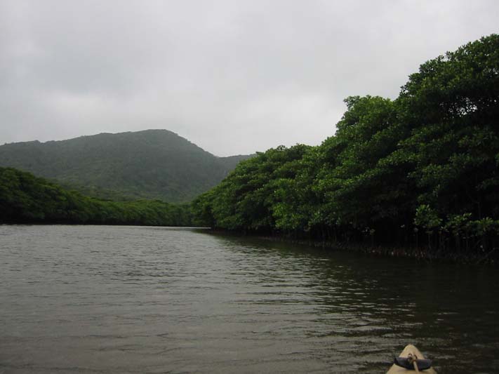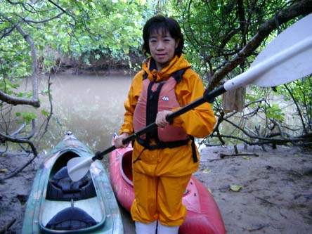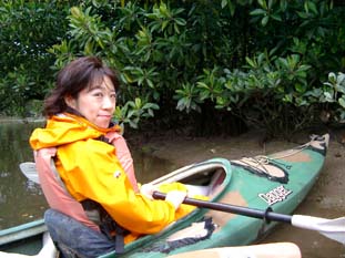 マングローブ林に囲まれた川をカヌーでを漕いで進んでいきます。この日は、風が強かったので、ひとり乗りとガイドの大滝さんと二人乗りで出発。帰りは交代した。