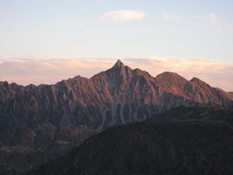夕方、三俣山荘前からの鷲羽岳と水晶岳、槍ヶ岳