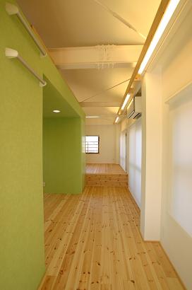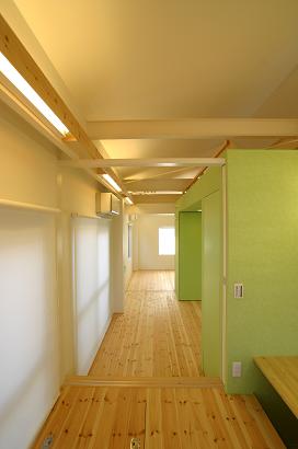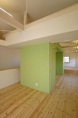 提案として全体をワンルームとし、中央にお施主様の好きな色であるGREENのBOXを配し、中央をセカンドリビングとして親子の触れ合いの場を提案した。 |
