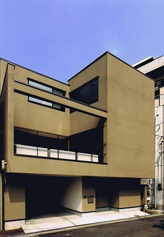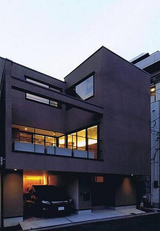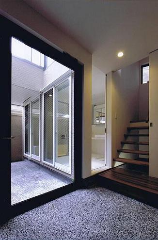 | 計画地は有名な造幣局の近く、桜が有名な大川越しに大阪城を望むことが出来る敷地です。室内のリビング・ダイニングから大阪城を眺めることができるのはもちろんのこと、広いデッキで大阪城を眺めながらバーベキューを楽しみたいとのご要望がありました。ただ周辺は商業地も近く中層の建物が多いため、プライバシーを確保する必要がありました。2つの相反する条件を満たすため前面道路側は窓の無い大きな壁面構成とし、その壁を穿つように大きなデッキスペースを設け、プライベートな室内空間と周囲のパブリックな空間をつなぐ中間的な領域として配置しました。そうして大阪城を眺めるハレの空間とは別に住宅としての心の安らぎを感じてもらうため中庭を設けてプライベートな抜けの空間を確保しています。広いデッキに出て大阪城を眺めるのはもちろん、夜には月を愛でてもらいたいと「観月の家」と名付させて頂きました。 |