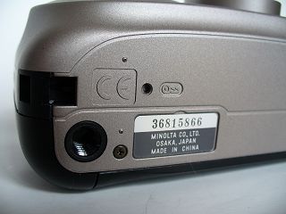 MADE IN CHINA 銘板です。Minoltaが生産委託した、あの工場で作られたのでしょうか。三脚穴は、お義理でつけたみたいに、端っこです。 ストラップは、この部分につけます。下にストラップ取り付け部があるのも、少ないかもしれない。だいたいは、横の真中かな。 |