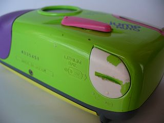 | 底の電池室の蓋は 白の軟質プラスチックに塗装してあるので、使っているうちにこうなってしまいます。なんで、塗装なのか、不思議です。べつに、黄緑色のプラスチックで、成型できると思うのですが、レバーがピンクのプラスチックなのに、なんで、電池の蓋だけ塗装なのと理解できません。 電池は、マンボウの時は、単三電池だったのが、巻き上げ、巻き戻しをモーターにしたためか、こいつは、リチウム使用です。 それから、「MADE IN JAPAN」です。 シリアル番号は、刻印ですが、なんと、溝に紫の色がついています。なんて贅沢なシリアル番号でしょう。まともな一眼レフなみです。 三脚穴はありません。そして、セルフタイマーもありません。 やはり、フィルム付きレンズのフィルム交換可能版ですね。 |