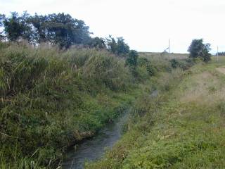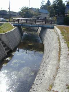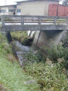 はじめに、見たところと地図でだいたいのところのアタリをつけたところを、虫食いに探してあるいて、なんとか、つなぐことができました。歩いた行程とは違って、とりあえず、上流から下流へ見ていきましょう。 羽黒川橋を渡って、上郷方向に行くと、目立たない橋を渡ることになります。橋には、銘板らしいものはありません。ただ、小さく、「昭和40年11月」と書かれています。この橋のわずか数メートルのあたりから、馬橋川は出発します。その上流は、田んぼの用水路の集まりです。その昔は、自然の川らしいところはあったのでしょうが、今は、その自然の川の名残を追うことは、不可能に思いました。 (2001.10.6 E950) |