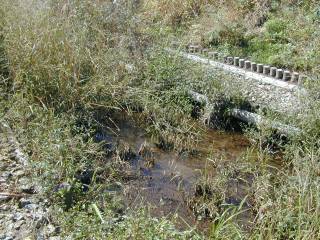 「森合橋」の上流で、水田からの用水路の水が入るので、馬橋川はまた、水量が戻ります。ここはちょうど、小さな山と山の間を流れると言う、摩訶不思議な状況でした。こんなところに川が流れているとは知りませんでした。車の通りは少なく、すぐそばのゴルフ練習場に来る車と地元の人しか通らないのでは。 (2001.10.6 E950) |