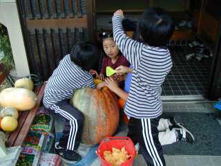 一番大きなカボチャは、みんなで彫るつもりでしたが、興味を示したのは、女の子だけ。