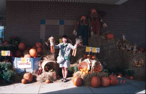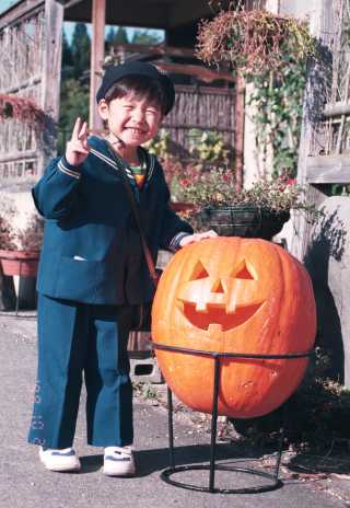 幼稚園の制服を着て、Jack-O-Lantern の前で記念写真。