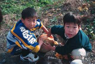 男の子は、野球をしたり、遊んでいました。3人でいっしょに手を突っ込んでも、まだ余裕。2年生ひとりと、4年生3人。
